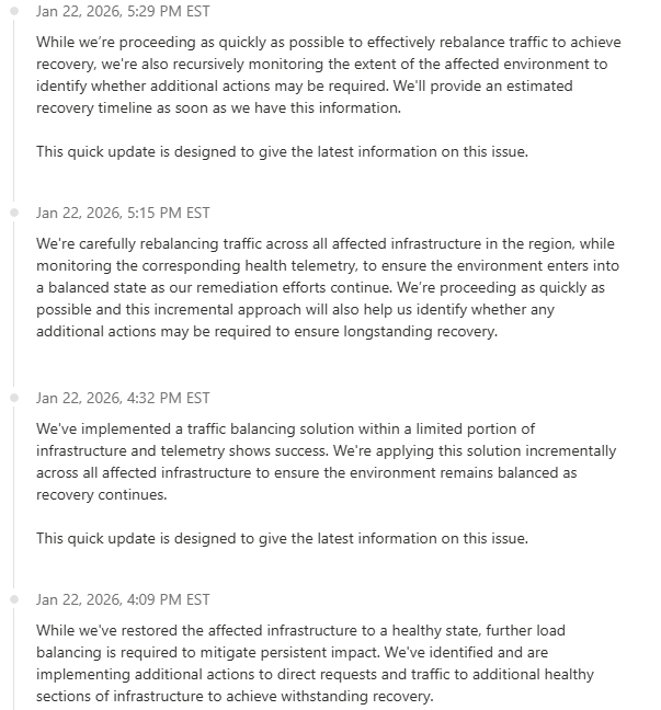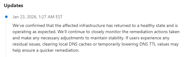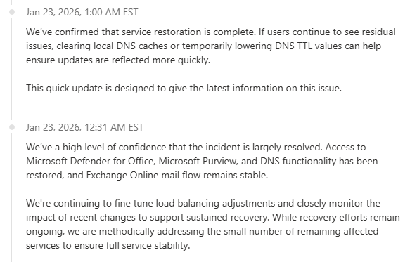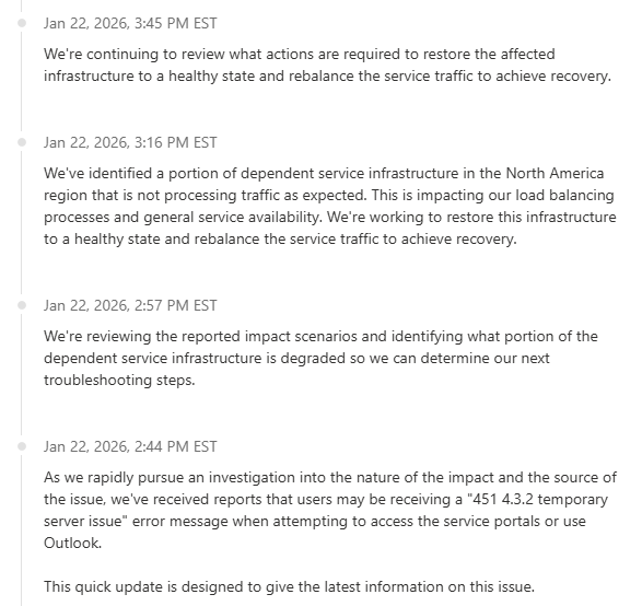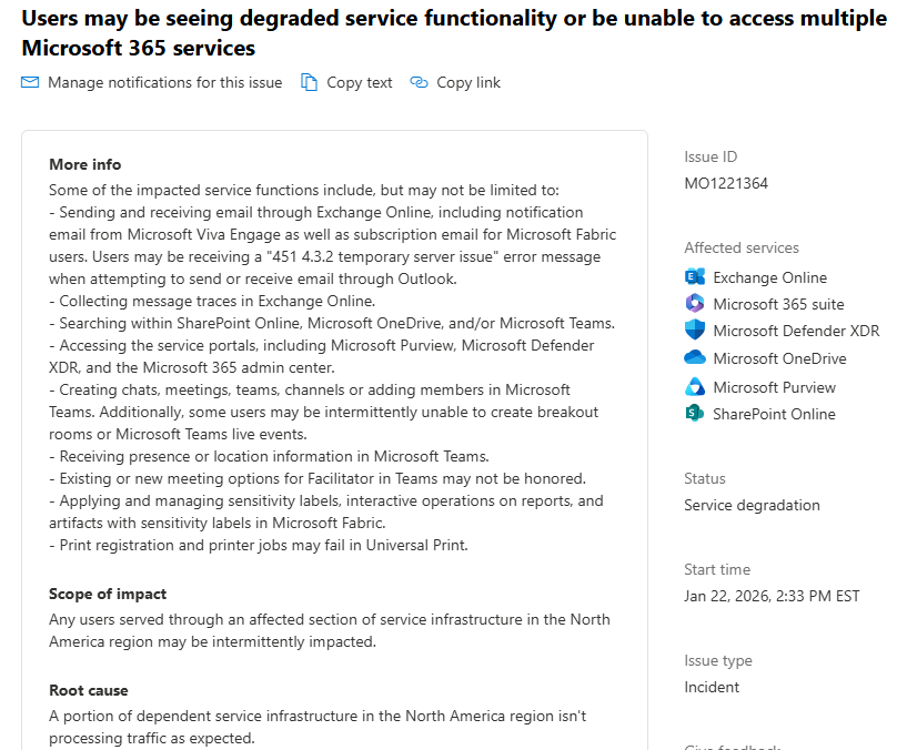 1/22/26 – We have had reports from multiple customers that Microsoft 365 services are not working, which includes email delivery and access to services. We will update this post as more information is available, admins can use provided link to see current status from Microsoft.